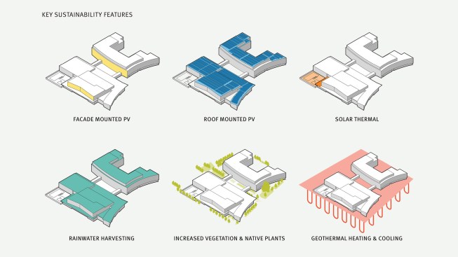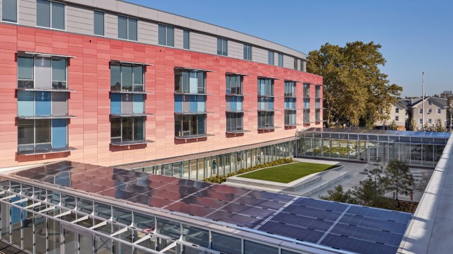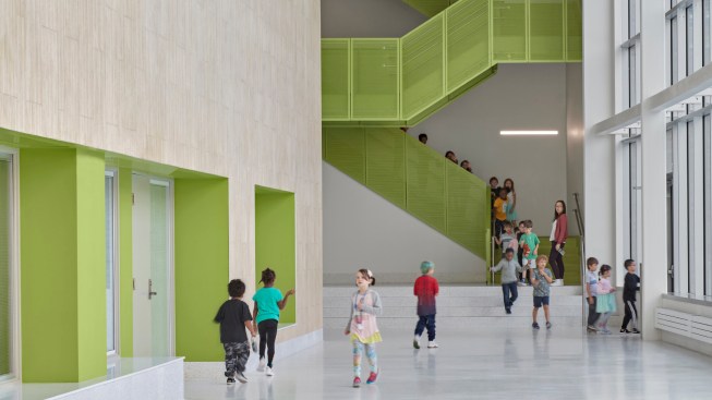The 273,000 square foot building is the new home of a preschool, elementary school, middle school, community services, public library, school district offices, and community pool. The building excels on all ten design measures, most notably Designing for Energy, Water, Wellness and Equitable Communities. The $130M project is Net Zero Emissions, with all-electric systems, and incorporates the City’s largest solar array to produce at least 60% of the required energy onsite. The remaining energy comes from Cambridge’s renewable electricity contracts to achieve Net Zero Emissions. Rainwater is collected on site and reused for irrigation and toilet flushing. The project is designed to perform at an ultra-low EUI of 25, even with heavy daily and year-round use. This is achieved using several unique planning and user engagement strategies in addition to building and energy efficiency systems. Building mechanical systems are ground source heat pumps supplying radiant heating and cooling and displacement ventilation with demand control CO2 sensors, providing improved thermal comfort, acoustics, and air quality. Other energy efficiency features include R-28 walls, R-40 roofs, a dedicated outdoor air system, daylight controls, LED lighting, and point-of-use hot water. Renewable energy is generated by roof, façade, and sunshade mounted PV, as well as solar thermal hot water to serve the kitchen and radiant loop. During the planning and design phase, the project team performed a comprehensive user engagement strategy to highlight the importance of user behavior on energy usage. “Net Zero Champions” were recruited from the faculty and staff to participate in a series of workshops to identify and evaluate user behaviors that contribute to inadvertent energy consumption. Strategies were identified such as a shared faculty workroom in each classroom neighborhood to provide common microwaves, coffee makers and refrigerators, eliminating individual units in each classroom. The entire complex must provide a safe, inclusive, and equitable environment for its community. The design supports this mission through its organization, enhanced interior environment, and community resources within an underserved area of the city. From job skills and ESL classes in the public library to community theater in the auditorium to inclusive special education academic programs, the building meets the entire community's needs. Cooling areas address the heat vulnerability of the neighborhood and provide welcomed respite. The schools' mission of social justice is reflected in the interior planning, signage, and displays. Students and faculty spend a lot of time in school, so they deserve a healthy environment to learn and teach. The building is designed to support wellness as an essential part of childhood development; the design acknowledges the degree to which the indoor environments can directly impact learning. Indoor environment, Universal Design, safety, and social equity are all important components of childhood development supported by this building. Materials were evaluated for their impact on health, and Red List Free materials were incorporated wherever possible. Connecting with nature through biophilic design, thermal and acoustical comfort, daylighting, and movement were fundamental considerations in the interior design.