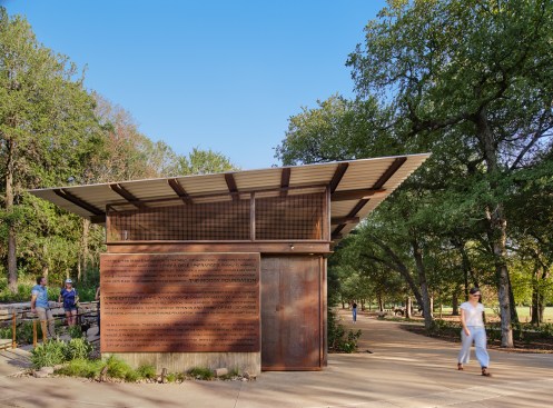 Located on the park’s western edge near the cottage, two new buildings serve to support the park. With walls of steel mesh for ivy to overgrow, the buildings tuck into the slope of the hill and gently recede into the background. The tree-covered hillside inspired the buildings’ muted material palette of vertical board formed concrete and weathering steel, where the patina will develop with time. A restroom building is organized like a classic dog-trot, with the vanities in the breezeway, looking through the building into the woods beyond. The storage building opens up to a new courtyard connecting the two buildings, where park goers and volunteers can congregate. With amphitheater-like seating built into the hillside, this space is the perfect spot to organize park volunteer workdays or just rest in the shade.