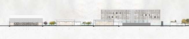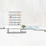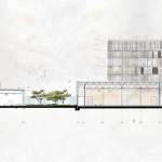 The 350-meter-long colonnade also acts as a linear public space, sheltering people from the ever-present rains that prevail most of the year around. The two ends of the colonnade also act as public gates to the whole complex. Attached to this public colonnade are the Press Hall to the Western gate and the Museum to the Eastern gate. At this end, the Museum forms the southern edge of the Piazza, while the shops and the public restaurant form the Northern and Eastern edges of the Piazza. This open space is also sheltered from the rain with a square oculus that allows the rain to fall in to a shallow pool at its centre.