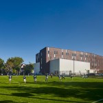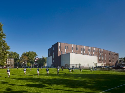 KIPP Newark Collegiate Academy is a thriving KIPP New Jersey High School, bursting at its seams with a population of 540 students. To better accommodate this wealth of learners, KSS is working to build a new, larger Academy which will phase growth to accommodate the 1,000 high school students who will progress through the charter network in the coming years. The new Academy is situated within the Littleton Avenue Redevelopment Area and is intended to provide community space for the neighborhood as well as the school. In addition to academic rooms, the 4-story building includes a gymnasium, café, and library—each available for use by the local community. An existing field will be upgraded with playing turf, preserving a sense of open space. To engage the street, the building is set on a glass base. The translucent-paneled gym emanates light to saturate the area at night. During the day, an expanse of windows along the café affords exterior views while students enjoy high-top café seating indoors. The building’s upper floors are bent to break down the building’s scale. With energy recovery units on the roof and handsome street and landscaping below, the new school will work hard to be just as smart and savvy as its students.