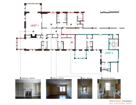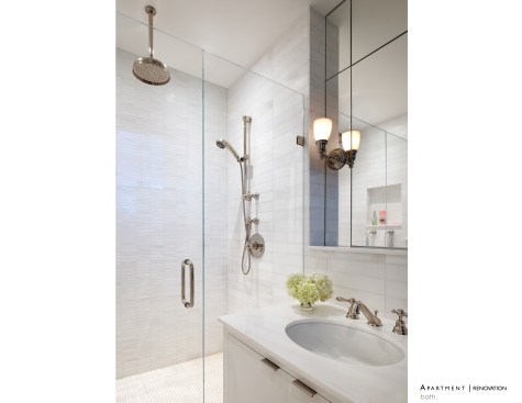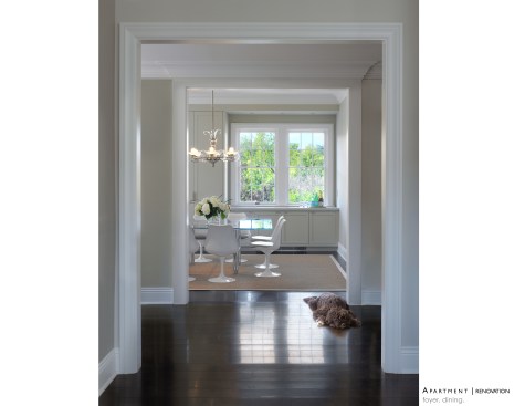 Carefully located interior openings provide cross axial views between the new kitchen and the other common spaces, while allowing for shared natural light in all directions. The apartment not only has natural light (and views) from three different orientations, but is further enhanced by a new 10’-6” ceiling height, reclaiming a foot and a half of previously concealed plenum space in this top floor unit.