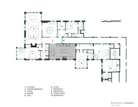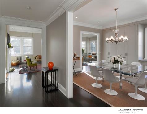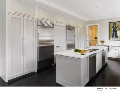 This project presents the classic challenge of combining two existing apartment suites and making them work together as one, large apartment. The kitchen plays an important role in the new layout, unifying the previously dispersed spaces of the individual units. It serves as a generous ‘hub’; accommodating multiple cooks and casual eating, while maintaining easy circulation throughout. This space becomes the communal destination for the family.