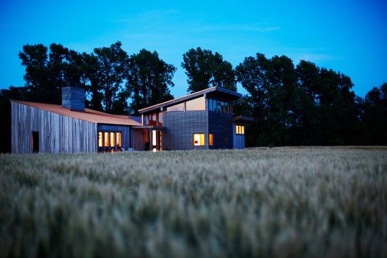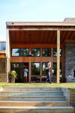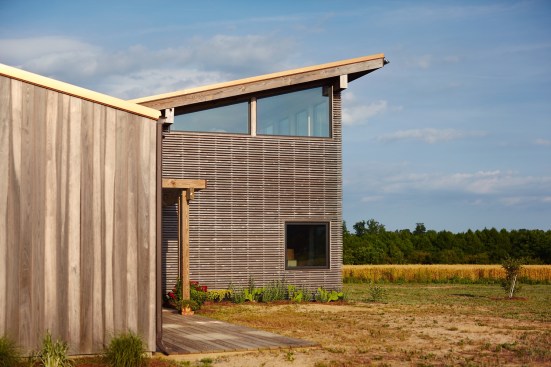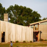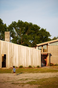 The structure of the home is simple and reminiscent of barn/shed construction with an interpretation that responds to the land features, the sun angles and prevailing winds.