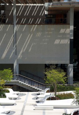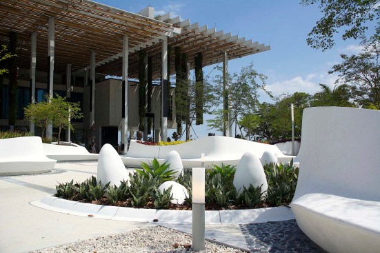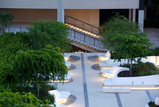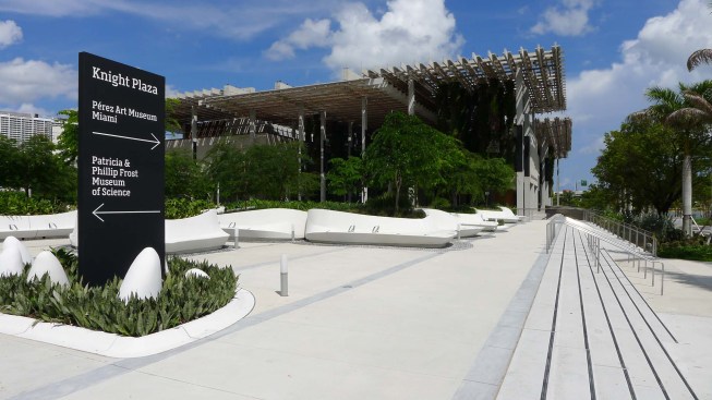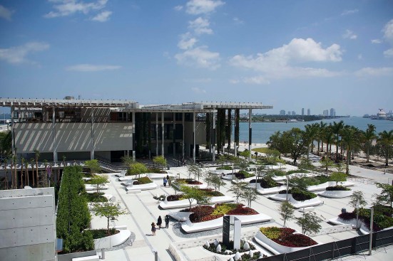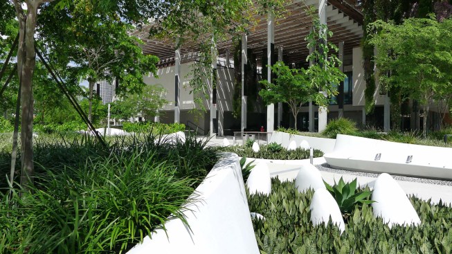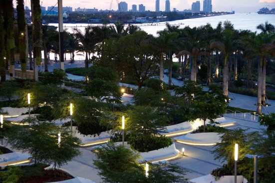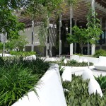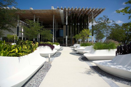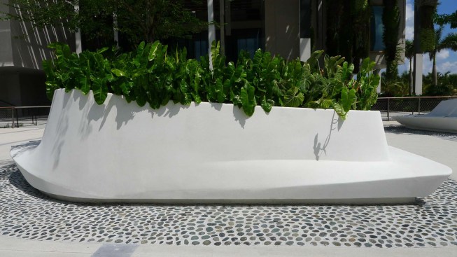 Situated on the edge of Biscayne Bay, Knight Plaza connects the Pérez Art Museum Miami by Herzog & de Meuron and the Frost Museum of Science by Grimshaw Architects. The plaza provides a lush focal point between the two museums. Designed as a comfortable oasis from Miami’s hot climate, the plaza showcases a splendid display of sub-tropical plants in groups of custom-designed flowing planters which morph from wall to lounge to seat in one seamless form.