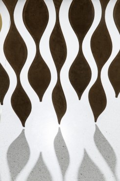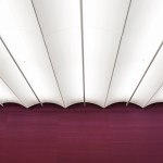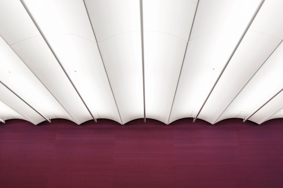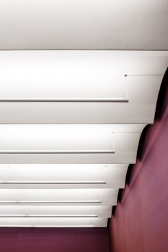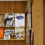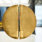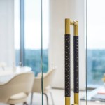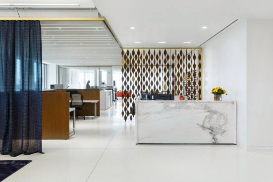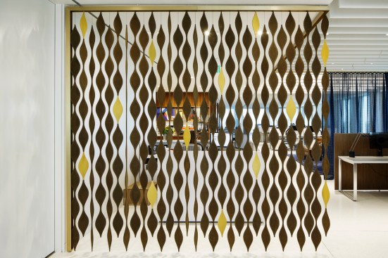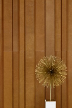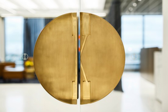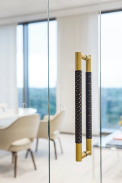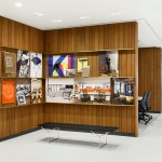 The design integrates Knoll textiles as architectural finishes, creating materially rich spaces and settings for the display of furniture and fabrics. White terrazzo floors are lined with brass divider strips and inlayed with an occasional historic brass “circle K” Knoll logo. White felt vaulted ceiling panels at the entry area and main conference room transition into white felt baffles, an acoustic finish that absorbs sound in the open office and showroom. A wall of natural Spinneybeck leather is a backdrop for the Knoll timeline at reception and flows into the adjoining small conference rooms. Echoing the brass floor inlays, the leather walls are “branded” with the ”circle K” logo, which is also translated into a large, custom brass pull for the showroom entry doors. Blue perforated leather door pull wraps reveal the brass of the typical door pull and add warmth and texture to the space while tying into the color palette of the showroom. Products from the Architecture Research Office Collection with FilzFelt and Spinneybeck, including Baffle, Plank, Arc, and Petal (a custom screen consisting of leather and suede petals) are used throughout the space.