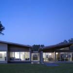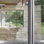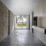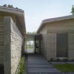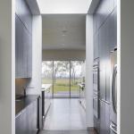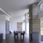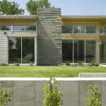Blunck’s plan lays out in two neatly balanced wings—public areas and children’s rooms to the south, garage and master suite to the north—separated by a gallerylike entrance hall whose glass end wall frames a view of a small fountain pool and the yard beyond, which borders the Missouri River. A 120-foot-long board-formed concrete wall defines one side of the entrance hall, projecting from the house at both ends. “It’s partly for function, partly for drama,” Blunck says of the wall, which manages views both from neighboring properties and between the wings of the house itself.