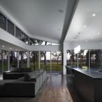 The house’s public wing centers on an open great room, whose flat ceiling helps define the cooking area and pitches skyward over the living and dining areas. The room “has views in three different directions; it’s clearly the hub of the house,” Blunck says. “The clerestory lights are oriented essentially to the south, to bounce light off the ceiling and even deeper into the space.” Glass panels in the pantry floor channel light from roof windows to the children’s lower-level playroom. Stained oak cabinets and PaperStone counters join the dark walnut floor as background for the room’s brighter elements—and for the sweeping view outside.
