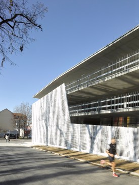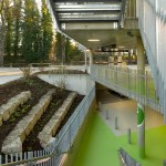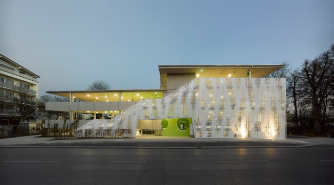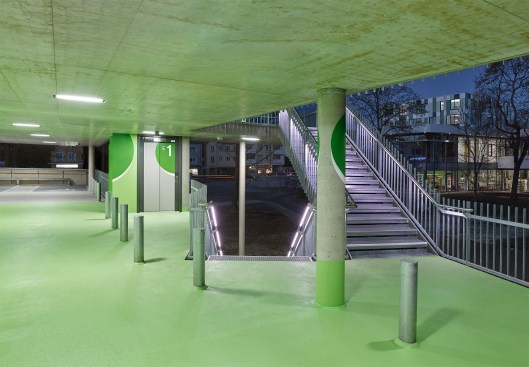 The facade design responds to three different urban situations: A solid parapet outlines the ascending ramp, while a lower parapet opens the building towards the park and allows views out. A perforated sheet metal façade contains the building and defines the city edge towards the streets in the south and west while remaining permeable. Greenery growing on steel-cable trellises around the corner cloaks the building towards the north-west, protecting against views, and is complemented by a closed parapet which reduces noise. The use of parapets instead of walls in conjunction with brightly colored floors and ceilings and a light well between the two parts of the building ensure sufficient amounts of sunlight.