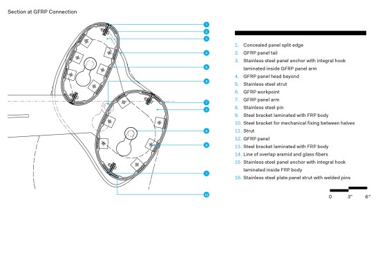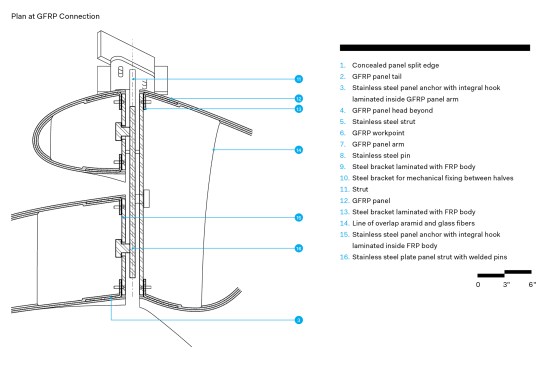 The solution was aramid, a material that has five times the tensile strength of iron. Kolon uses it in applications such as bulletproof helmets. Used as an added layer in the composite mix to strengthen the glass fiber-reinforced polymer, it allowed the architects to achieve a graceful organic form with minimal connections to the building. “With aramid,” Mayne says, “we were free to develop our own language that wasn’t limited to the shape of the material.”