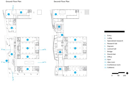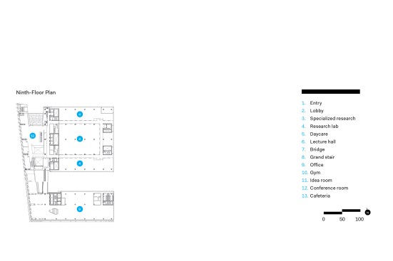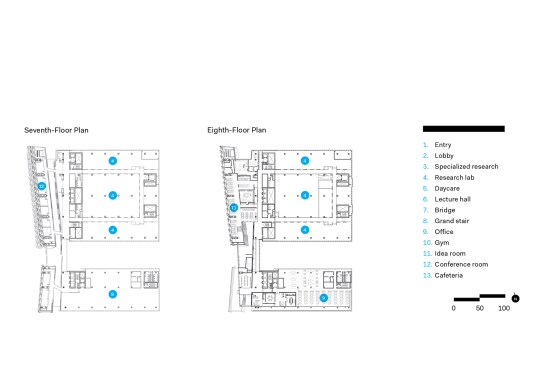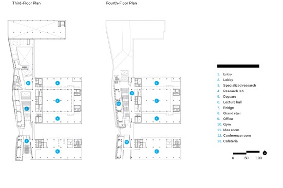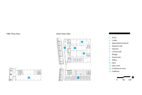 The building is split between back-office research wings—which make up 85 percent of the floor plan—and the public-facing atrium, which connects the research wings and acts as the building’s front door. By creating 400 diamond-shaped liner panels using 8-meter-long swatches of Kolon fabrics in varying degrees of thickness and opacity, and placing them in vertical layers through the 30-meter-tall atrium, Morphosis was able to shade and diffuse the strong western sunlight, add light as needed with embedded LEDs, and help control acoustics in the cavernous space. The “stretchers,” as the firm calls the fabric pieces, can also be swapped out, making them a rotating product showcase as well as a shading system.