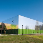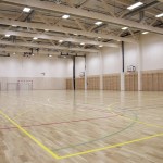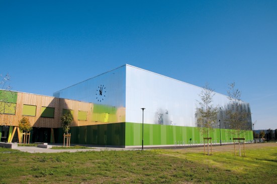 Levken said one creative measure the design team took was to use large, mirrored surfaces, both on the façade of the sports hall and under the ceilings around the entrances, which produces a very exciting effect in that the Steni panels under the ceiling look twice as big. And the mirrored façade of the sports hall reflects the surrounding forest.
