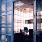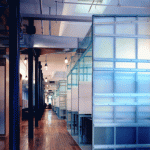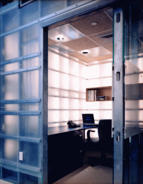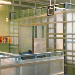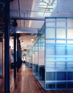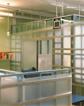 Clear green acrylic gave glimpses of the exterior and let light in making these small spaces much ;larger as they participated in the entire space visually. From the exterior the materials glowed under both natural light from skylights above and artificial lights at night. The glow of the boxes fills adjacent workareas with an even light 24/7.