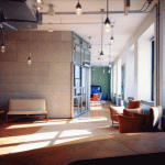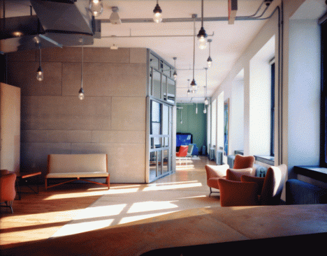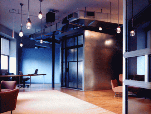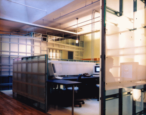 Simple materials were used to create modular workspaces between office blocks. P-lam, brushed aluminum, translucent plastis, etc. At the head of the long blank wall, windows above union square provide light and views of both the farmers market below and sky above. A glazed wall with operable panels seperates the conference room from the open loft-like attitude of the lounge and entry and the technology laden conference room.