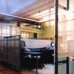 With three walls of windows and a long demising wall with none, the blank wall was a prominent element. The solution used the long wall as both an organizer, lumps of offices were stuck to it with simple work surfaces in between office blocks, and as a reflective surface, a light greenish painted plaster reflected the natural light as a strange green murmur felt throughout the space. Along the blank wall, the office blocks were constructed of light gauge steel studs, the simplest of structural systems, with applied panels of varying translucencies to allow light to penetrate into the offices.