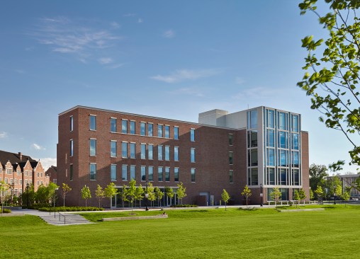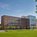 The architectural palette of brick with limestone accents builds upon the existing campus vernacular. The new buildings frame a major new campus green, also designed by the submitting team, to support informal recreation and provide a center for outdoor community life in the district.