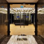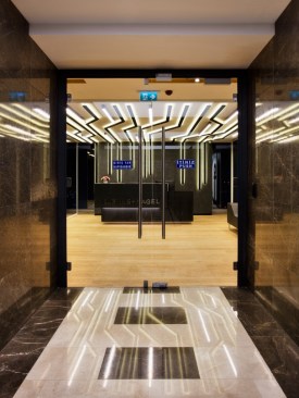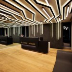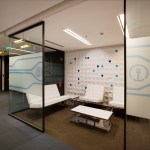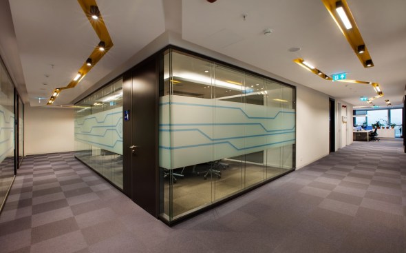 The general plan scheme is identified with an elliptical floor plan and a ceiling installation around the core that shall bring the transportation business to mind. Linear channels on the ceiling are highlighted along the core via light strips. The same light strips pass through to the vertical facade on the reception walls and are used for highlighting the entrance to the suite from the elevators.