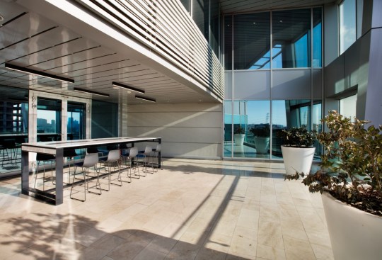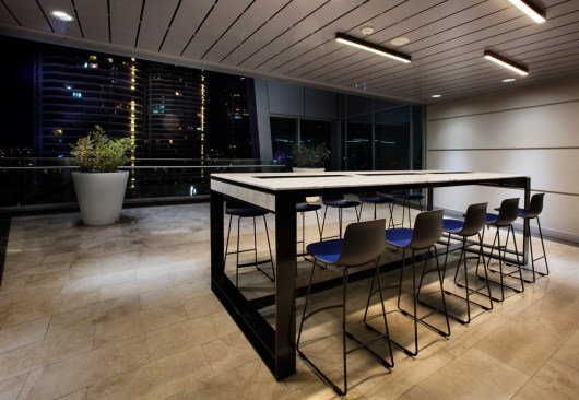 The road design around the core highlights and promotes the corporate identity of the company via the panels on the floor corridors. Floor gardens have comfortable sitting areas designed to enable the staff to meet and socialize with each other during their breaks in an outdoor environment.