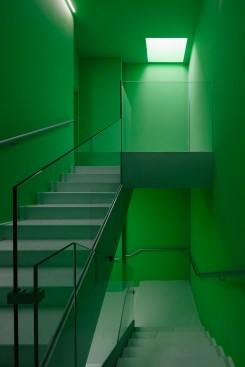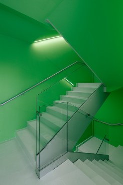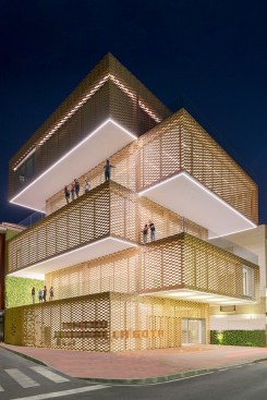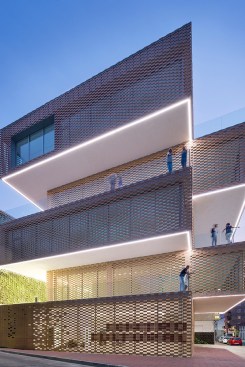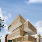 The five floors of the center are set on five displaced boxes, one above the other. The floors are staggered in the areas where boxes are flying to create the effect of a box “on the other.” The post-tensioned structure of the building permits, through active reinforcements, large spans and reduces the slab edge profile. This structural system not only uses less material and creates a lighter structure, it also increases the bearing capacity of the concrete and it prolongs its life span by reducing deformation and decreasing cracks.