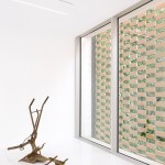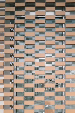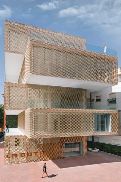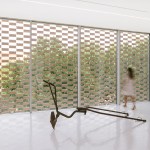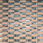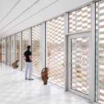 The façade is made up of a double skin composed of a glass wall and ceramic fabric. A thermal space is created between these elements, preventing the summer heat to enter the building, while allowing views that are created from the inside evoking the image of the tobacco drying-buildings.