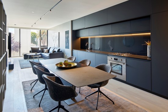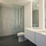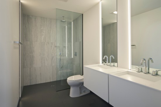 The interior is modern with clean lines. The bedrooms are strategically and carefully tucked away from the living spaces. There is not a single wall or a bump-out from any misalignment of vertical shafts. Each kitchen is extensive with various storage components, the 14 totally linear feet allows the storage capacity to increase by 18% compare to other condominium kitchen kitchen models offered in the market today. The bathrooms are spacious, finished in custom cut natural stone, and fully integrated lighting and storage compartments.
