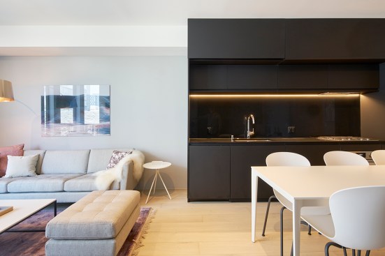 Efficiency in the building design, construction methods and budget engineering also took part in our design process. The stacked floor plans limited the kitchen types down to four configuration through out 28 units, the coordination and fabrication of the kitchens were easily manageable. All vertical infrastructural components continue vertically with zero interruptions, allowing the construction sequence to replicate through out each floor. The various repetitive elements through out the building limits the framing cost and eliminated variables that a non-repeated floor plan building typically creates. Together, the construction was completed in 14 months.