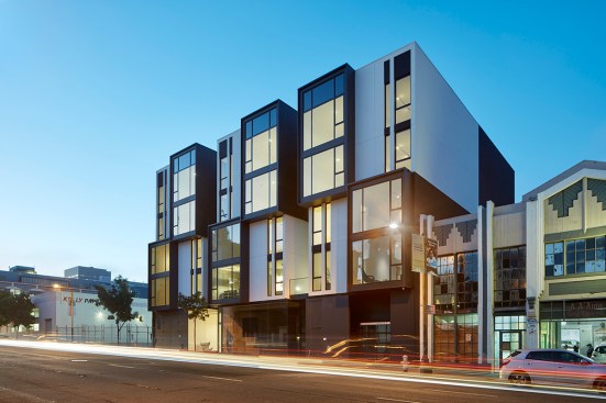 The programs expands and contracts following the shifted form of the building. The two primary exterior materials enhance the language of the shifts – smooth plaster in white, cement cladding panel in matte black – like a series of urban homes in homogenous composition. Given the rooted history of live/work lofts in the SOMA district, the facade articulation continues this recognizable characteristic by the recalibration of the building form and exterior materials in the double story scale.