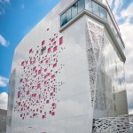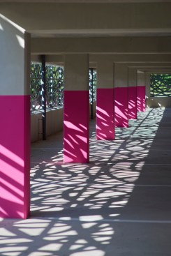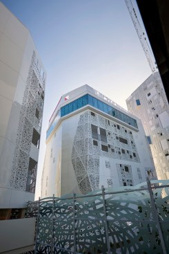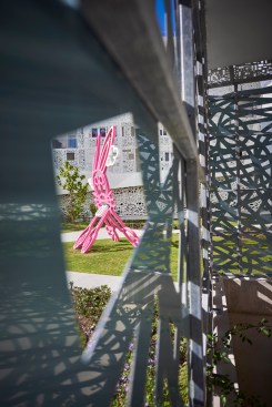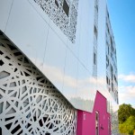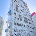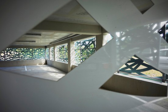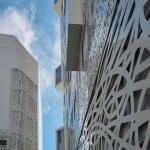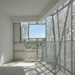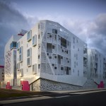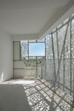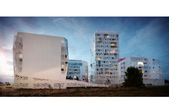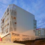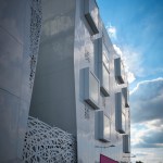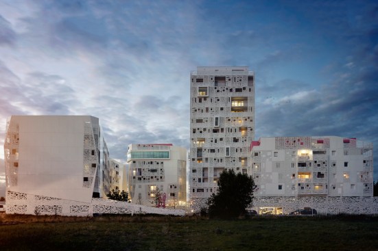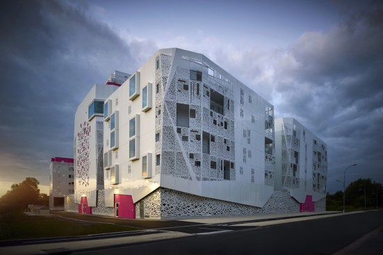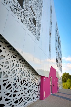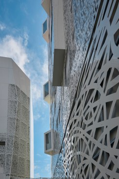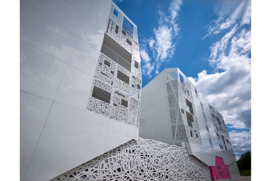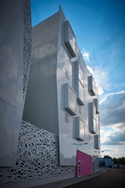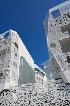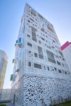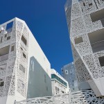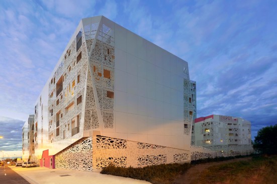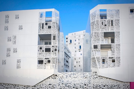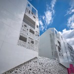 The whole building is made of thermedia concrete, allowing more efficient insulation and decreased weight of the building, compared to a conventional concrete. On the facade, a perforated skin lace envelops the different blocks and confers privacy and sun protection to each unit. On the first two levels, a mesh designed by Jofo artist shelters the parking lots, lifting the volumes off the ground and creating a link with the street. The park, bordered by the harmonious structures of the buildings, unwinds its curves between the buildings. This park offers a space of relaxation punctuated by visual breakthroughs. The heart of the ilot is embellished by metal sculptures of Jofo artist.
