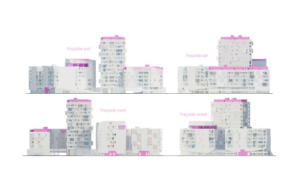 This project is named "La Part des Anges". It is intended as a colorful sculpture offering a landscape changing over its course. The signal tower located at the center of the parcel, around which void and filled areas alternate, participates in the will to create a strong gesture, a signal, aimed at energizing a developing sector. The project consists of 4 blocks located around the 15 story tower.