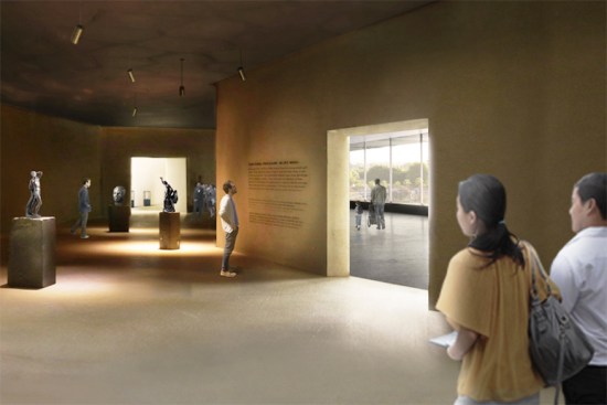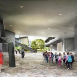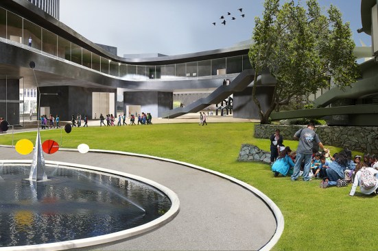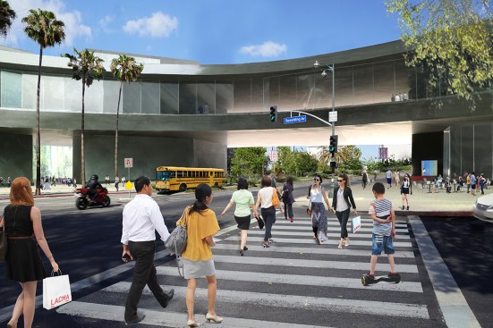 The new building would be composed of eight semi-transparent pavilions that support an elevated, organically shaped, and translucent main exhibition level. The main exhibition level would extend over Wilshire Boulevard to the Spaulding lot on the southeast corner of Wilshire Boulevard and Spaulding Avenue. The project design will open up two-and-a-half acres of new public outdoor space, including landscaped outdoor plazas, public programming and educational spaces, sculpture gardens, and native and drought-tolerant vegetation integrated with the new building and the surrounding park. Existing spaces on the Spaulding parking lot will be relocated to a new parking structure to be built on the west side of Ogden Drive, south of the corner of Ogden and Wilshire Boulevard.