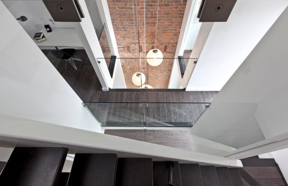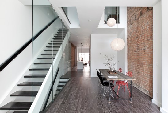 The long, broken, and dark Victorian interior spaces on the ground level are now contemporary white and airy continuous spaces with just enough exposed brick wall in the kitchen and dining room to remind us of the origins of the house. The enclosed long and linear staircase used to be both a physical and a visual barrier between the interior rooms on the ground level. Now it is transformed into a light, and open structure circulating around voids and creating a dynamic connection between not just the ground floor spaces, but also all the levels. On the second floor the bedrooms and the home office are connected with a bridge overlooking the stairs and the dining room. A unique modern master bedroom with a freestanding tub and a direct access to a private deck is on the third floor, the attic, where the roof structure is exposed once again as a reminder of its past.