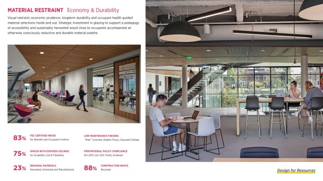 Consciously subtle in its portrayal of sustainability, this LEED Platinum building is a confidently restrained, beautiful, high performance building that has set the bar for sustainable building on campus, catapulting the College toward the President’s pledge of carbon neutrality by 2035.