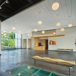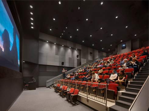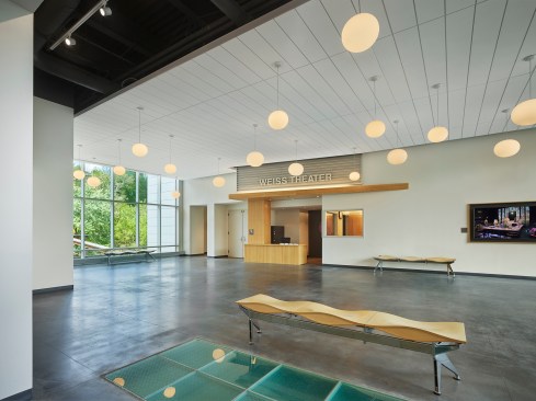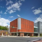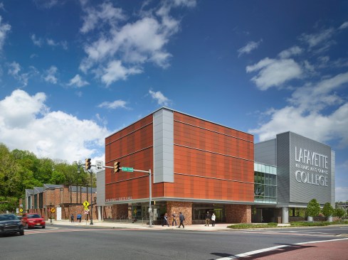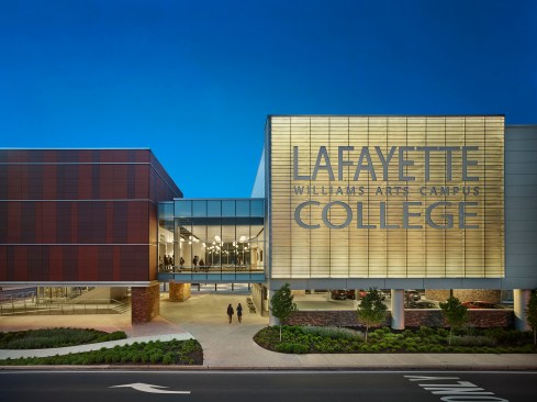 Seeking to bring together its Film and Media Studies and Theater programs while creating a welcoming gateway to Lafayette College’s campus, the City of Easton, and Williams Arts Campus, the College teamed up with KSS to complete two projects that transformed the front door of its campus into a vibrant arts community. Together, the renovation of the Film and Media Studies Mohican Building and new Theater Building provide opportunity for new cross-department collaboration, create a welcoming center for community engagement, and preserve and protect the sensitive natural environment surrounding the Bushkill Creek. Situated along Easton’s main thoroughfare, the new Theater Building is lifted off the floodplain creating a suitably dramatic statement for Lafayette at the gateway of campus. Designed with sustainability and responsible stormwater management in mind, it incorporates solar panels and a green roof. Visitors pass through Lafayette’s “arts walk” and existing sculpture plaza to enter the Theater Building through a stunning glass vestibule. Moving up to a central lobby, students and the public find ample room for college and city events. The renovation of the Mohican Building provides much-needed room for faculty offices and strengthens the building’s flood protection.