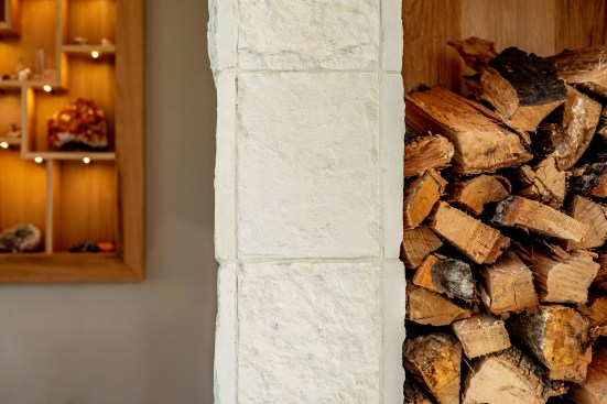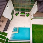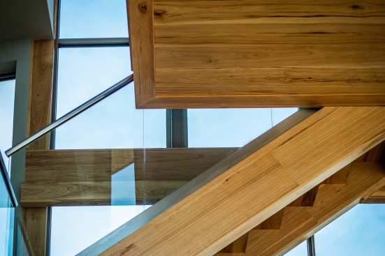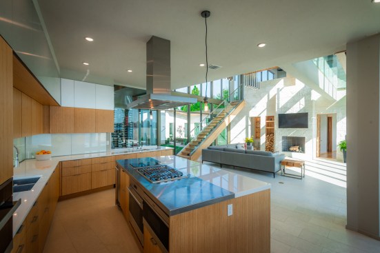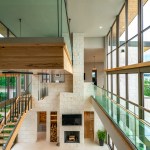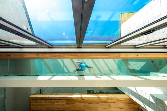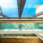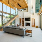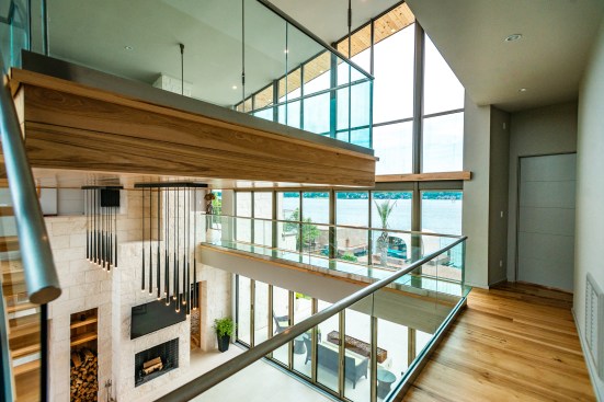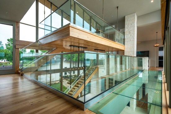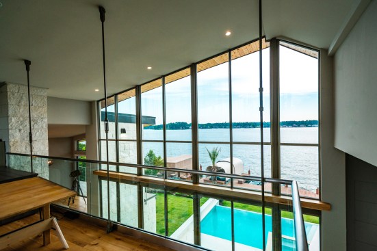 Zoning and design standards are meant to be bent. The incorporation of a suspended atrium floor, while technically meeting the design standards, was a moment of play by the architect and owner, while also creating a singular statement space. Suspended from the structural space frame, above the double height living space that doubles as the secondary entry, the clients’ home office/library is connected to both the lake views and street front via floor to ceiling glazing, while interiorly connected to the rest of the house by the internal atrium.