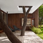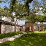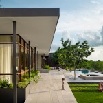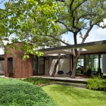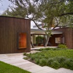 Located on a hillside in Austin, Texas, the Lake View Residence by local firm Alterstudio Architecture is sandwiched between a grove of mature live oak trees and a view of the nearby 200-acre Bright Leaf Preserve. Floor-to-ceiling glazing in the open-plan house captures a vista of the protected wildlife area, and thanks to the structure’s thin profile (it’s only one room deep in most areas), those same spaces also overlook the trees at the front of the wedge-shaped property.