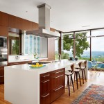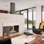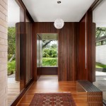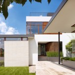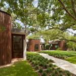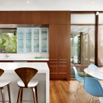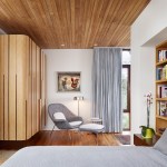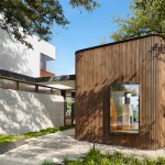 The entrance is tucked behind a curved enclosure clad in 2×6 and 2×2 cedar boards, which were custom milled for tongue-and-groove installation to minimize visible hardware and stained to contrast with the white masonry of the other volumes. Indoors and out are connected by a white ceiling plane that continues from the porch into the living spaces; the wood continues inside as well with custom-designed cabinetry, paneling, and millwork throughout, all using reclaimed or FSC-certified materials. The house is sited for optimal natural ventilation and cross-breezes, but it also is outfitted with a geothermal HVAC system and a photovoltaic array, as well as tankless water heaters. —Katie Gerfen