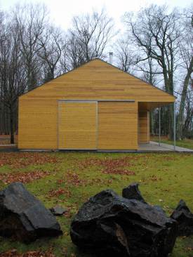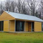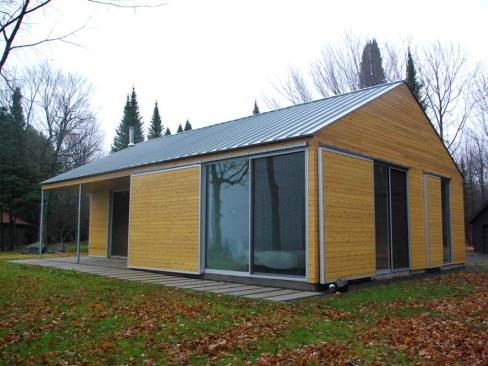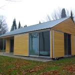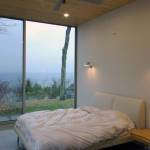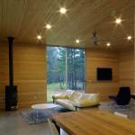Another challenge was the remote nature of the site. In order to maximize the cost efficiency of the structure and minimize the environmental impact of the project, the house was designed using locally shop fabricated components and indigenous building materials. All of the walls and roof trusses were fabricated by a local wood truss manufacturer. Because all of the glazing was full-height, the wall panels were all simple rectangular units, designed as modular components, that were easily and quickly assembled on site. Locally harvested and milled white cedar was used on the interior and exterior surfaces of the building. Concrete from a nearby supplier was ground and polished for the floors throughout the building and was heated by a high efficiency boiler system. The only major building components not manufactured locally were the zinc roof panels and the monumental aluminum sliding glass windows. Both were selected for their longevity and their ability to be recycled after use.