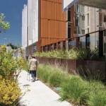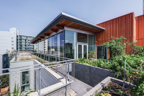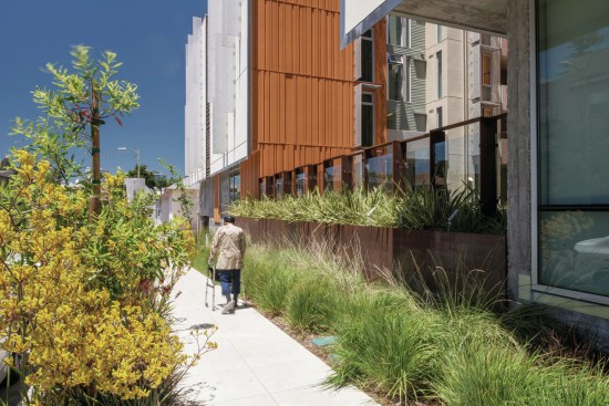 DBA exploited the site’s slope to give access to underground parking from grade at the north end of the building. The garage accommodates 60 cars—a high number for the project, but it also serves another senior apartment building across the street that previously used this site for surface parking. Now, instead of blacktop, 30% of the site supports vegetation, mostly native or climate-appropriate, where the previous parking lot, with its impervious surface, supported none. Raised planters and permeable paving allow 80% of rainwater to be managed on-site.