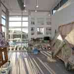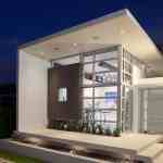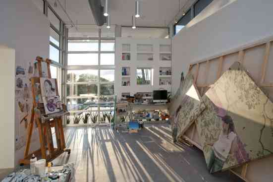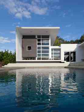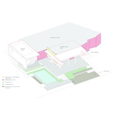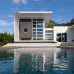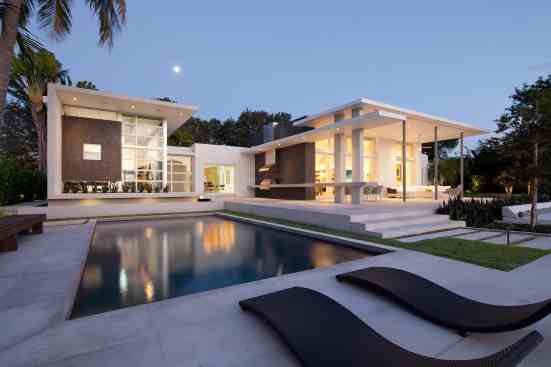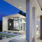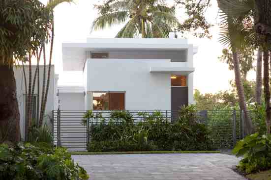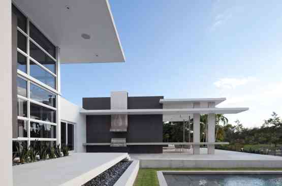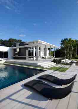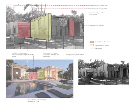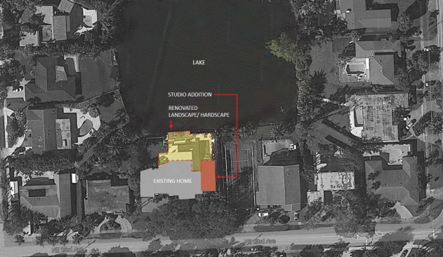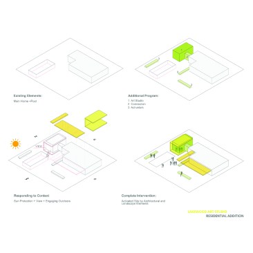 Nestled between mature oak specimens in the front and a lake in the rear, the 4,800 one story vanilla box home was begging for a connection to its sub-tropical setting. The vast open, yet decaying spaces in the rear of the 23,000 sq ft site were in desperate need of an intervention. The opportunity presented itself when our clients, a couple with three children, approached us with the request to add an artist studio for the mother–a painter– on the Northern edge of the property. They also wanted to re-design the outdoor areas which consisted of a worn out fabric canopy, a pool, and a large expanse of unusable open space which sloped down to the lake. The client’s needs included a painting studio with ample work and wall space as well as vast amounts of light, an office and a bathroom. Outdoor terraces were emphasized as part of the program, as well as a Bar-B-Q area that would support serving and entertaining functions. Designing the studio as an anchor for a series of outdoor spaces, the addition/intervention strived to shake the existing structure and connect it to its beautiful natural setting in order to celebrate South Tropical indoor/outdoor living. The 800 square foot studio addition seems to float above the home’s new terracing, helped by a floor plate that extends beyond the edge of the studio and is lit from underneath. Windows that face South and West are shaded by deep overhangs, while North-facing clerestory windows have no shading device, making certain the studio is filled with indirect, natural light by day. The front of the studio, facing the lake is comprised of storefront panel next to a large wall stone clad wall which frames a small, square window, in a way acting as signage that this is indeed a working artist’s atelier. The outdoor spaces were designed with the help of a series of floating slabs to the South which provide balance for the studio structure on the North edge of the property. The interplay of sliding planes, lights and darks, solids and voids echoes the tools of an artist at work, while fulfilling specific functions: The two tall concrete columns help separate the outdoor living space from the pool area as well as provide structure for the upper and lower canopies. The upper canopies provide coverage for outdoor living and sunshades, while the lower canopy serves as food prep and serving space for family gatherings. Despite the restrictions and limits on glazing/mullion ratios of the South Florida hurricane building code, the project aimed to connect the interior spaces to the outdoors in every possible way. This included large sliders, plantings at the edge of both, the studio and the covered terrace areas, as well as the linear canopies that thrust the entire setting towards the lake. The end result is one that connects our work to the essence of place and purpose: the new outdoor rooms reenact the outdoor Florida living experience of the 40’s and 50’s prior to the advent of central air conditioning. To quote our clients, “they are the most lived in spaces of our home” and thus stand as testimony of all that South Florida living can be.