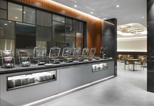 The two structures are combined with an amorphous wall concept created in the middle section. In the hotel structure, where the reception counter, sitting areas, offices and a lobby bar are located on the ground floor, rooms are located on the upper floors and the breakfast room is located on the basement floor.