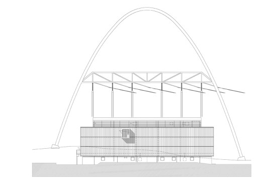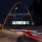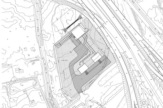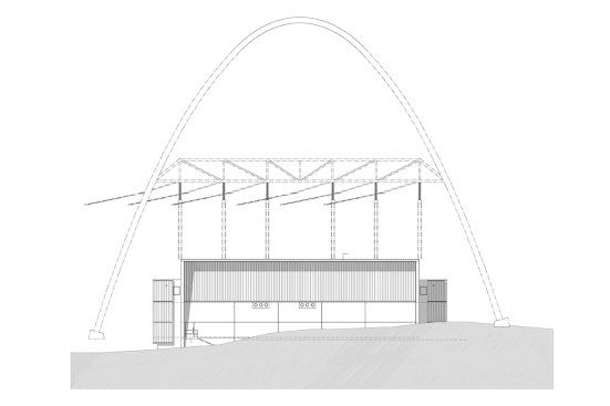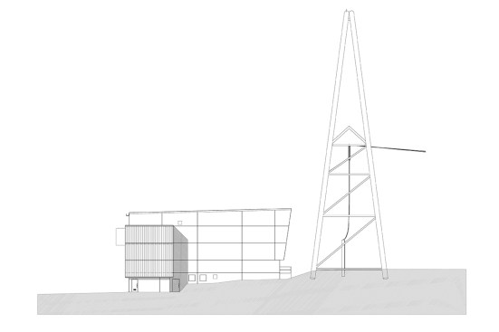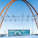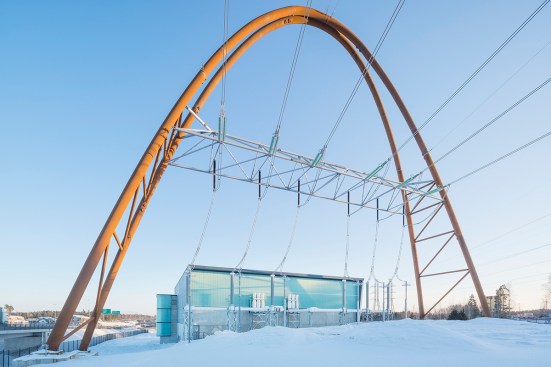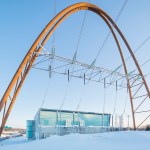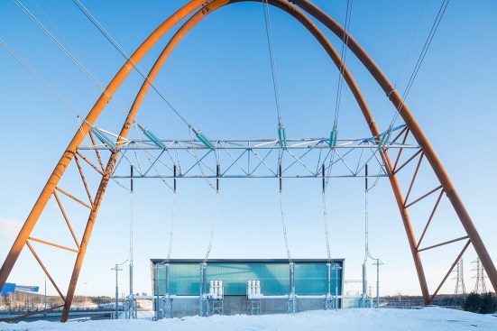 The placement of the building volumes on the site, as well as their plan configurations, follow functional requirements without, however, setting any strict boundaries that would have inhibited creative and open-minded architectonic expression. Thus what is generally a greyish and nondescript transformer building became a gleaming lantern and an ordinary vertically trussed landscape portal became an approximately 50 metre-high classically arch-shaped icon for the area.