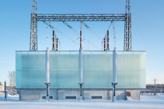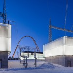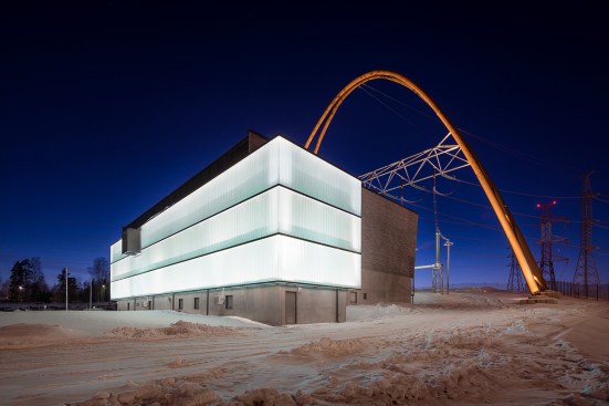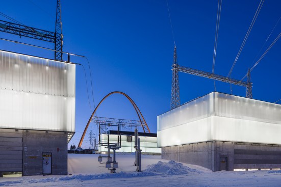 The transformer building’s main materials are naturally coloured graphic concrete and glass. The facades’ most visible themes are cladding elements assembled from glass planks detached 600 mm from the main volume. When the interstice is illuminated in the evening, the lantern-like buildings express electricity as a visible phenomenon. The selected glass type provides a direct association with the glazed insulators used extensively in the electricity distribution industry.
