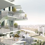 I designed this apartment complex, consisting of about 100 units, in Montpellier in the south of France. In this city with a Mediterranean climate, it is warm enough to eat outside even in the winter, so the local residents spend a lot of time on their balconies and outdoor terraces. The new typology I proposed in this plan, calling for an over 50-meter-high building, was inspired by this type of climate and lifestyle. The idea is extremely simple. Countless, huge balconies extend from the 17-floor apartment building. The structure is linked to a riverside greenbelt, and I did my best to block the sight light from surrounding buildings while giving the volume an organic form. The hundreds of balconies combine with the curved form of the structure, giving the overall building a distinctive appearance, like a huge tree.