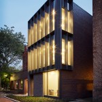 Inside, spaces are meticulously planned for utmost efficiency with the elevator, mechanical systems and restrooms along the east wall. The innovative use of a space-saving scissor stair as primary circulation allowed for two-story openings into the center of the plan. The program is stacked from the more public facilities on the first floor to more private spaces on the third. It contains areas for informal student gatherings, small study spaces, a few offices, and a multi-use “smart” classroom. Coupled with brightly-colored furnishings and clean, modern lines, the day-lit spaces are pleasurable for group study.