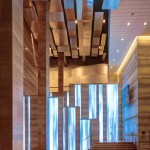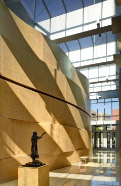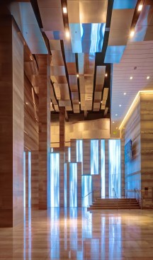 The building’s two distinctive shapes — the curvilinear Council Chamber and the angular seven-story glass office structure housing the city’s administrative departments — merge inside the lobby. The horizontal veining and varied surface texture of the lobby’s stone floor and walls evoke canyon layers and fissures. Set between the Grand Staircase’s stone piers, laminated glass planes of variable thickness and finish are lit from behind to resemble water and reveal the concrete blocks with which the Hoover Dam was built. Metallic ribbons referencing the desert spring waters make up the ceilings of the Council Chamber and the lobby. Their satin and polished silver and bronze surfaces symbolize the diversity of the city’s population and reflect the uniqueness of all who enter. At nightfall, programmable LED lights affixed to glass fins on the southern facade are illuminated. Dancing across the building’s face, the solar-powered light shows are an exuberant tribute to the citizens and a beacon to all that the new City Hall has arrived.