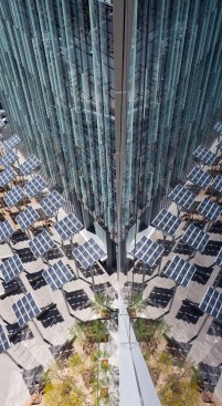 The design of the new Las Vegas City Hall represents the city’s past, present, and future through its relationship to the environment: the Council Chamber refers to the Indian Springs Preserve, the city’s original source of water; the main façade is a metaphor for the Colorado River, which generates the city’s energy at Hoover Dam; and the photovoltaic trees generate energy from the sun — the future source of renewable energy. The overall design also expresses the values and potential of a richly diverse citizenry and its philosophy of open government, as well as the city’s commitment to a sustainable future.