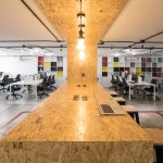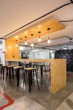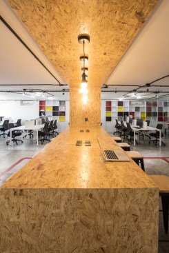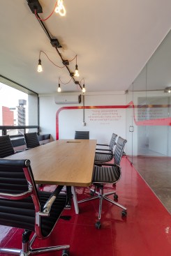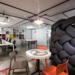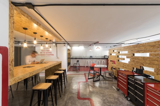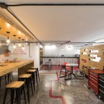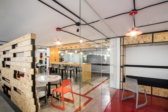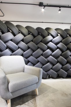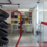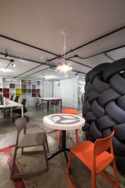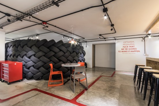 Conceiving a new space to represent the tasks of the company, by optimizing resources and reusing some of the existing elements, was the aim of the renovation project for the Mexico City LATAM Autos Corporate offices. The commercial activity of the company was taken in consideration during the creative process, inspired by the aesthetics of the car and elements related to it, such as mechanical workshops and roadways. A wall made out of recycled tires was proposed as the project’s main element, and its construction was a great challenge. The wall divides the interior into two main ambiences. The lobby, where the clients are received, also incorporates the meeting room. The facilities for employees, such as offices, and informal work, rest, and recreational areas, are located on the back. Red lines that go across the different spaces recall the trajectory of a car in motion. Materials like raw concrete, OSB recycled wood and steel, as well as exposed pipping and industrial furniture, were used and adapted to the requirements of an office space to create an atmosphere that is similar to a mechanical workshop. The LATAM offices transmit in every detail the brand’s essence through an innovative and daring proposal, that breaks with the conventional patterns in the corporate office design.