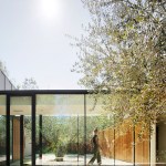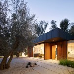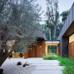A walkway of concrete pavers, lined by wild grasses leads to the front door, passing a tranquil courtyard with olive trees. The entry to the house is located within a glass hallway connecting the living pavilion to the west and the sleeping pavilion to the east, establishing a sense of intimate scale before engaging with the other parts of the house.