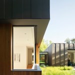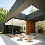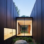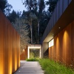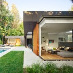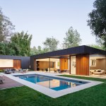 Composed of three pavilions connected by a series of glass hallways, the single-story residence seeks to create a residential oasis in the heart of Los Angeles. The Western Red Cedar lined guest house/garage pavilion establishes a datum line that carves and connects the two larger volumes of the living and sleeping pavilions, comprised of oversized charcoal-colored board, batten extira and cement board siding.