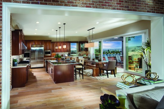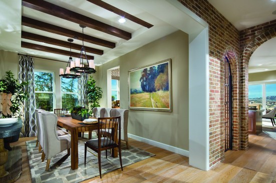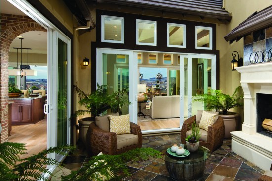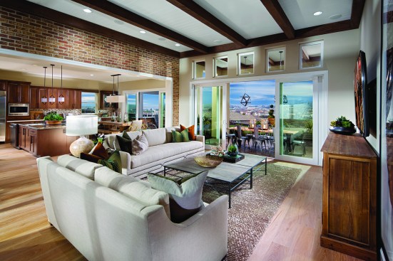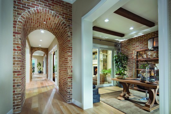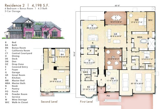 Plan Two “X”, is a single level plan in origin, that is offered as a “hybrid” two level home with a Bonus Room and Bedroom/Bath or two Bedroom/Bath + Loft, on the second level…accessible from the Great Room. This added design flexibility allows buyers to “live” single level and still enjoy the flexibility and opportunity offered with a two level home…additionally, providing further Architectural dynamic to the neighborhoods curb appeal. Efficiency of plan’s internal design, allows for maximum living footage with minimal circulation, allowing for greater room flexibility and option opportunities. The large “Atrium Courtyard” is the homes “Core”, which allows natural light to flood the plan from within and is connected both visually and physically to the Den, Dining and Great Room…from which the indoor/outdoor California Room is accessed, greatly expanding the Great Room’s livability and function opportunities.