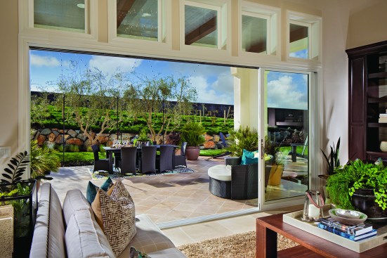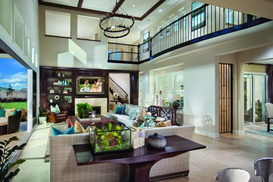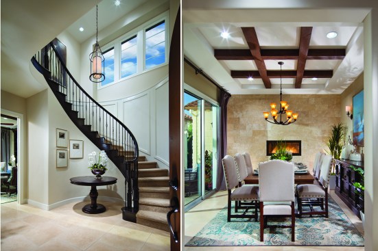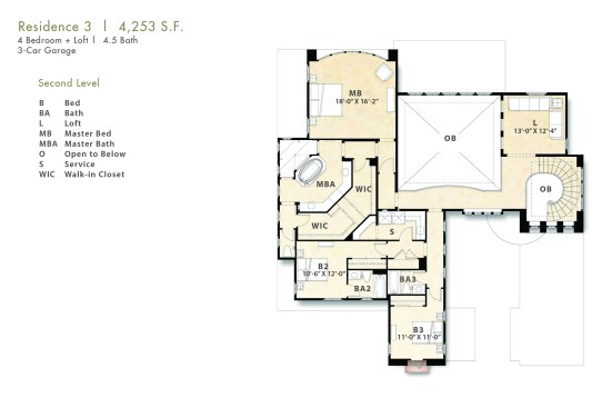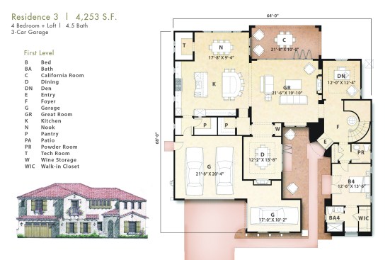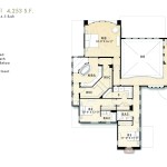 Plan Three, is a two level home, that offers a series of special experiences…both indoor and outdoor, formal and informal. The entry court is unique to this plan and provides the home with a “second” usable, integrated outside living opportunity, with ample room for fireplace, lounging and access to both a Guest Suite and Formal Dining/Office space. The entry experience is “elegant”, with Den access and curvilinear stair…flooded with natural light within two level volume. The Great Room is the “Heart” of this home, whereby the gourmet Kitchen, oversized morning nook, formal dining and California Room is accessed. Uniquely, the Great Room, though centralized to the plan, is adjacent to both the entry court and the California Room, thus providing double exterior visual and natural light exposure opportunities. Further, there is a flex option (1 of 14 plan options) that combines the 1 car side loaded garage with the Dining/Office space, providing a dynamic Bedroom/Living Suite with bath and kitchenette. The upper level offers a dramatic, window enriched two level volume at the Family Room below, with additional bedroom suites and graciously amenitized Owners Suite and Spa bath.